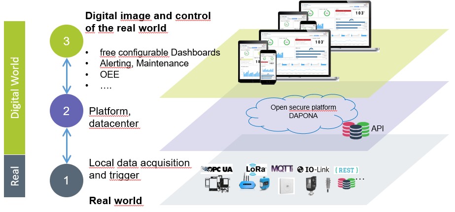 Die Wahl der Sensoren ist dabei völlig frei: z.B. eignen sich für die Überwachung von Temperaturen Funksensoren, die nach dem LoRa-WAN-Funk-Prinzip arbeiten: Sie sind batteriebetrieben, weisen eine hohe Reichweite auf und können einfach an beliebigen Stellen im Betrieb platziert werden. Bevor die Batterie zuneige geht, meldet DAPONA rechtzeitig, dass bald wieder ein Wechsel ansteht. Dies ist ca. alle 1,5 – 2 Jahre der Fall, je nach Sendehäufigkeit und Umgebungstemperatur.